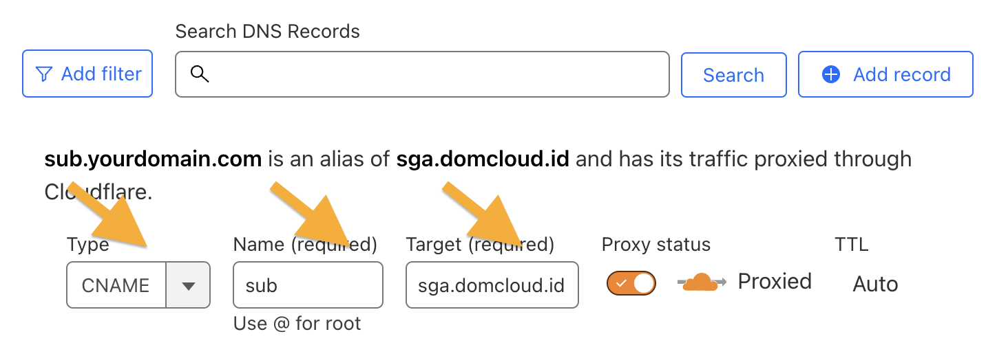 For example we'll hosting sub.yourdomain.com at DOM Cloud but using Cloudflare DNS, then in Cloudflare, add these records: