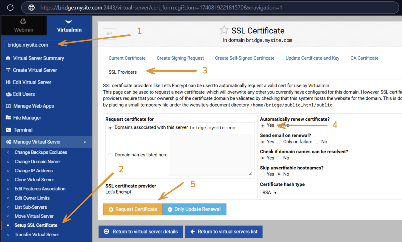 After setting the DNS records correctly, open the Virtualmin UI at https://bridge.mysite.com:2443 (note the HTTPS part!). Ignore the certificate warning for now.
